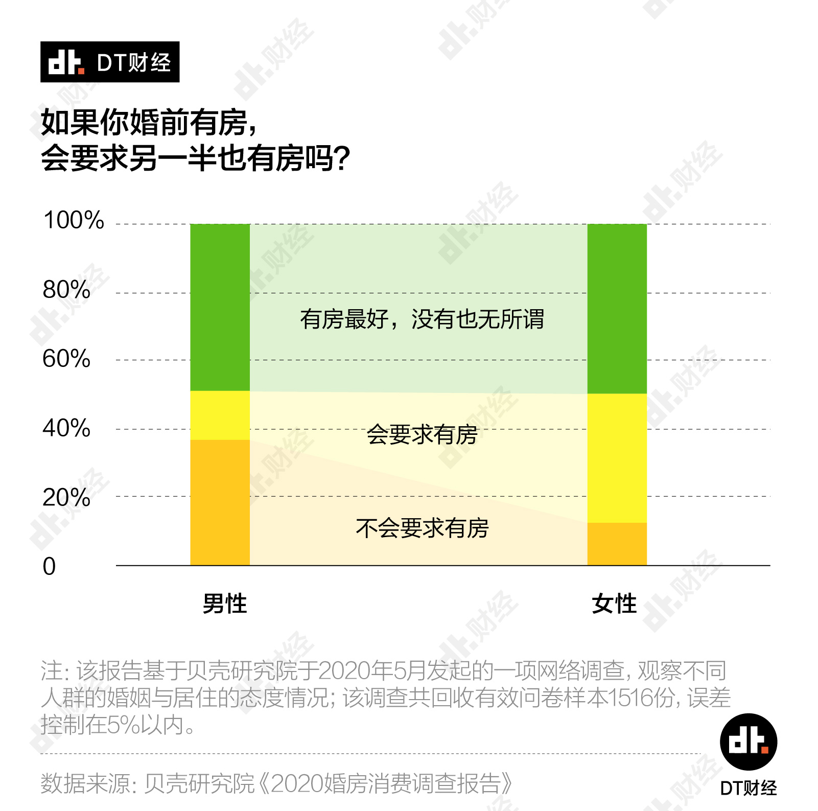 反观男性这边,他们对另一半的财产要求相对较低。在“你如果婚前有房,会要求另一半也有房吗?”问题下,15%左右的男性选择了“会”。而女性当中,有近4成受访者要求双方资产能够互相匹配。