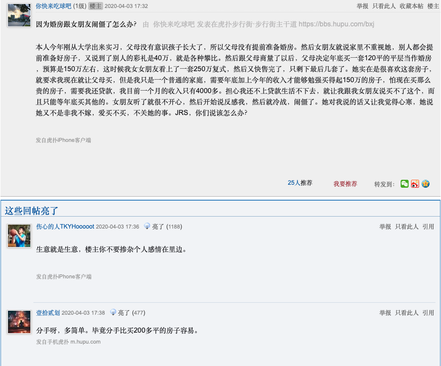 一通分析下来,男性读者难免会觉得有些委屈,传统压力和现实数据都让他们备感压力。重压之下,自然有人觉得不公想要放弃,或是告诉别人应该放弃。虎扑上一篇名为《因为婚房跟女朋友闹僵了怎么办?》的帖子中,楼主的女朋友向他索要一套价值250万元的婚房。最终男女双方因为婚房价格闹翻,楼主向网友求助是否应该答应女友的要求。在所有回复中,简短的“分手比买200多平的房子容易”收到了几百次点赞。一句振聋发聩的“生意就是生意,楼主你不要掺杂个人感情在里面”,也让JRs认清了当前的现实。