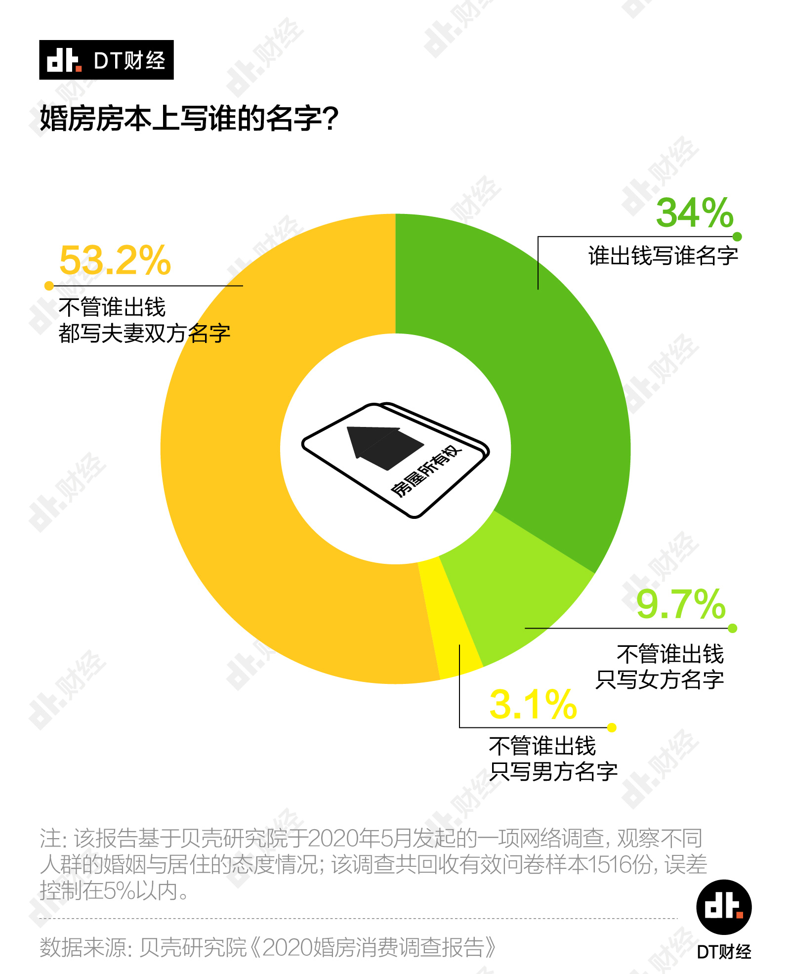 到这里,也许不少选手已经被劝退。继续前进的勇士,不出意外会迎来第二项考验——房产证上的名字写谁的?总体来看,超过半数人认为夫妻的名字都要写。有34%的人更理性地觉得,谁出钱就写谁的名字。但在剩下的人群中,有近1成受访者表示,无论谁出资都应该只写女方的名字。这个比例是“不管谁出钱都只写男方名字”的3倍。