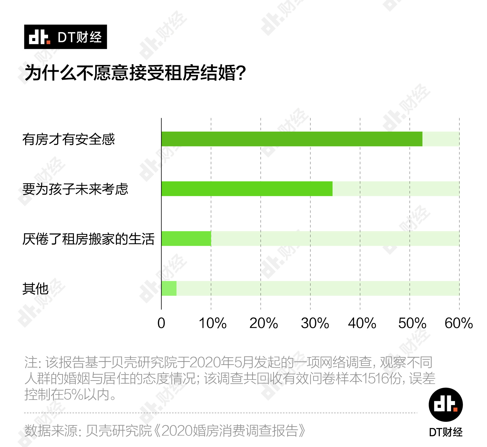 年龄角度分析,越年轻的群体越难以接受租房结婚。将调查对象按年龄分7个阶段后,我们发现年纪最大的75后对于租房结婚的认可度最高,只有不到4成受访者强调了房子对于婚姻的重要性。与人们的固有印象相反,从小就生活在互联网时代,更加开放多元的95后在对于婚房的态度上反而是最保守的。95后群体中,拒绝租房结婚的比例达到56%,是适婚人群中最高的。还在谈恋爱的00后们,已经有超过六成人对婚姻有了要求——一定要有房。谈及拒绝租房结婚的原因,受访者们给出的主要原因有三个,安全感缺失、为孩子考虑、厌倦了搬家。