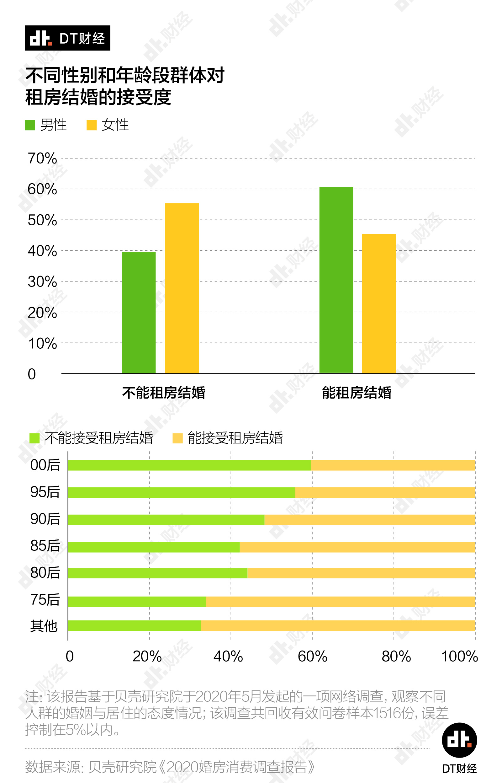 没有房子你还会结婚吗?调查显示,“租房结婚”和“无房不婚”的态度几乎各占一半。但以性别和年龄为区分,我们得到了一些有趣的结果。从性别来看,男女之间对于租房结婚的态度存在比较大的差异。调查中,六成左右的男性愿意租房,但只有44.9%的女性能够接受无房结婚。对于大部分女性来说,拥有一处自己的房子仍然是成家的必要条件。