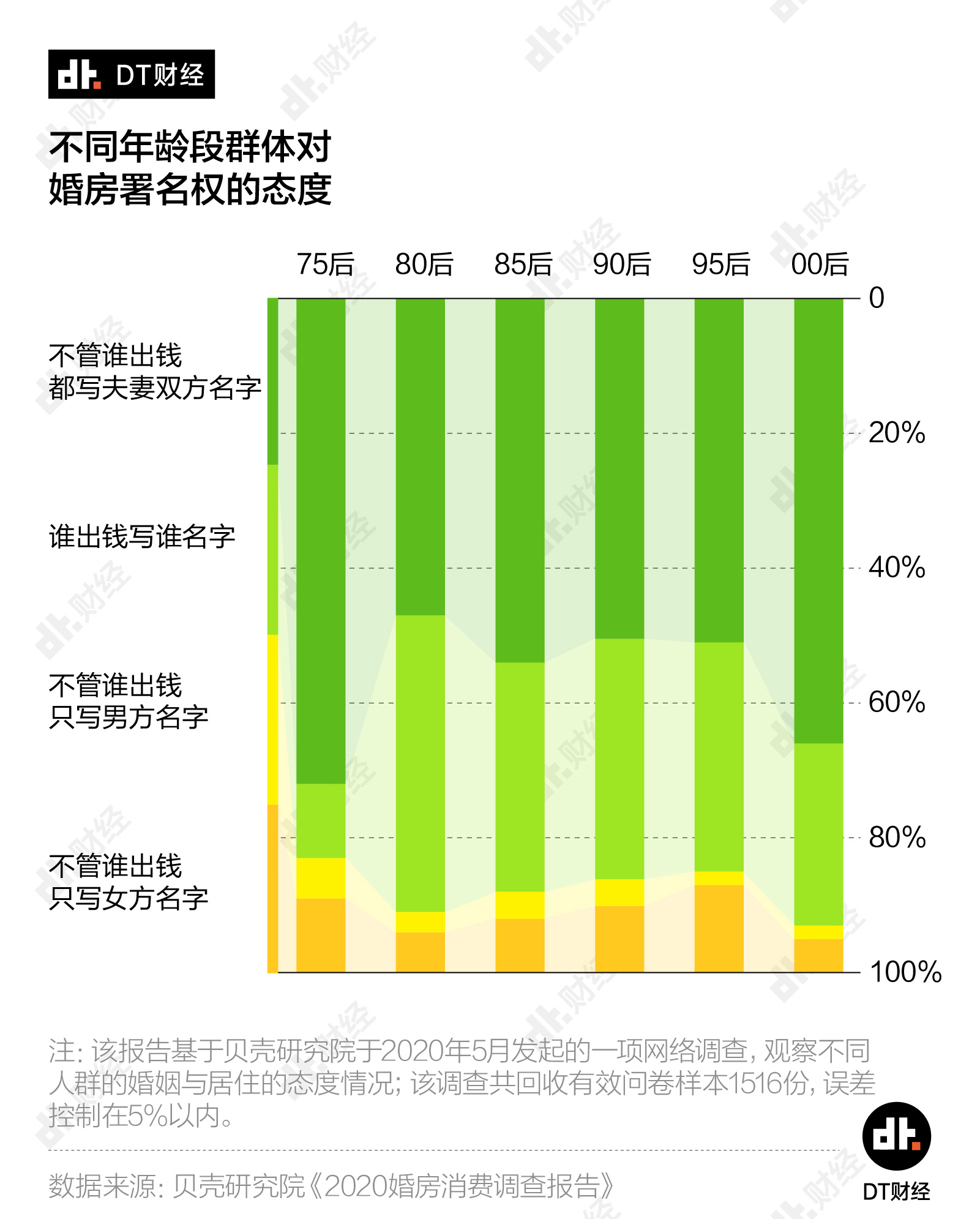 这个观点有些出人意料,却似乎又在情理之中。所以我们继续按照年龄分层,看看每一代人对于“只写女方名字”的态度如何。从75后到00后的每一代受访者当中,认为房产证上只能有女方名字的人群都要高于只写男方的人群。这种观点在95后人群中尤为明显,有12.6%的受访者这样认为。