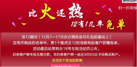 在12月7日-31日期间,用户在京东金融使用京东白条购买中国人保或阳光保险的车险产品,最高可享12期0首付0服务费。