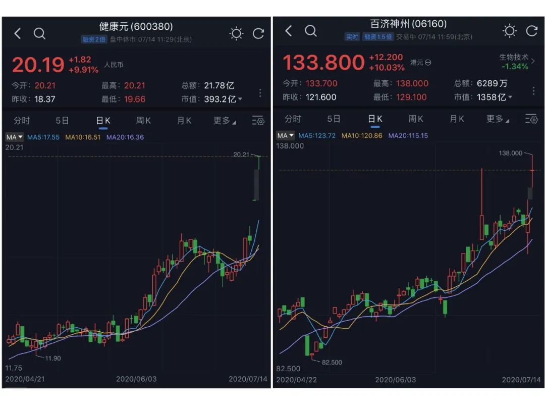 受此消息影响,今日健康元和百济神州股价应声大涨。7月13日当天,健康元开盘一字涨停,报收18.37元/股,市值达到358亿,今日再次涨停,股价创出20.21元/股新高,截至中午休市总市值达393亿元。今日开盘,百济神州大涨近10%逼近涨停、后有回落,市值刷出新高1365亿港元(约1247亿人民币)。