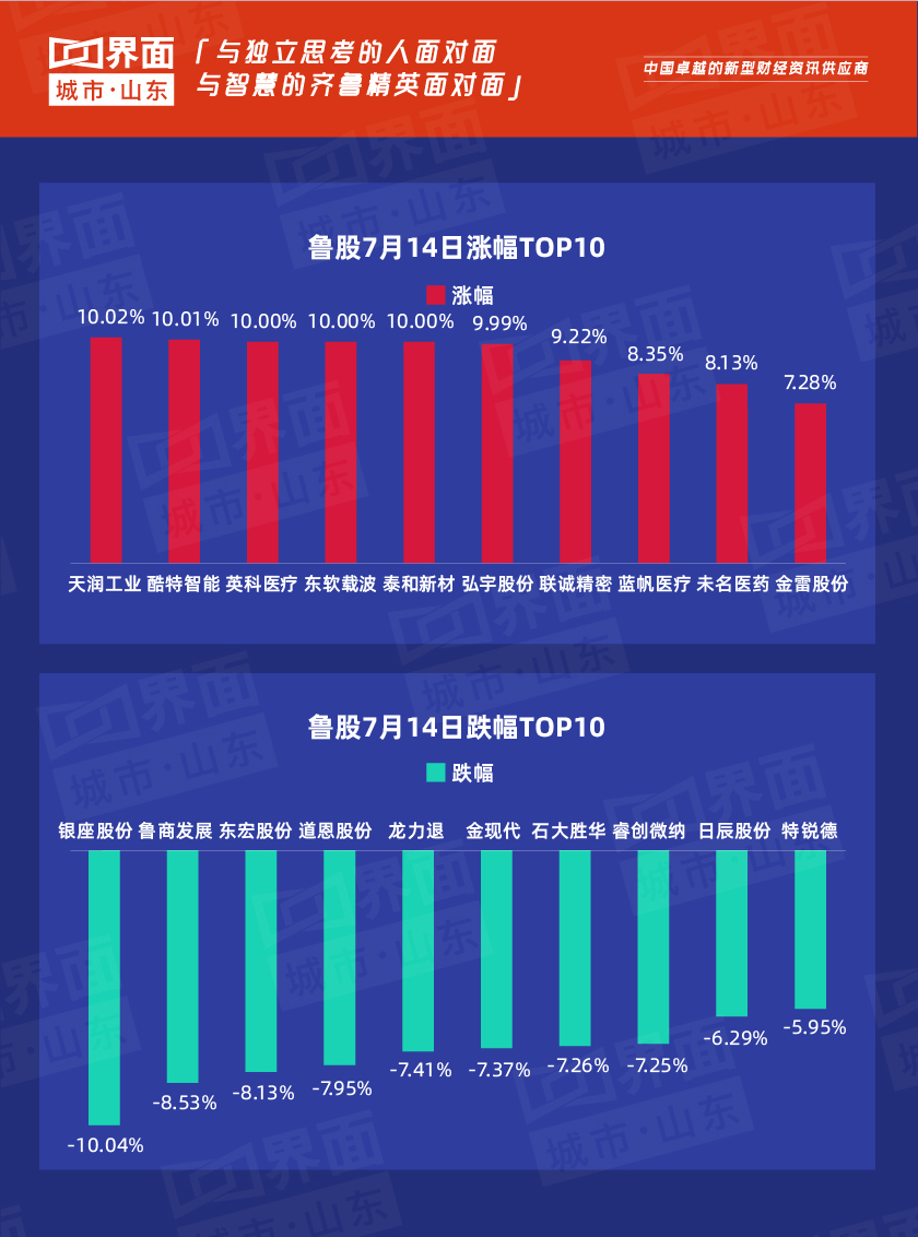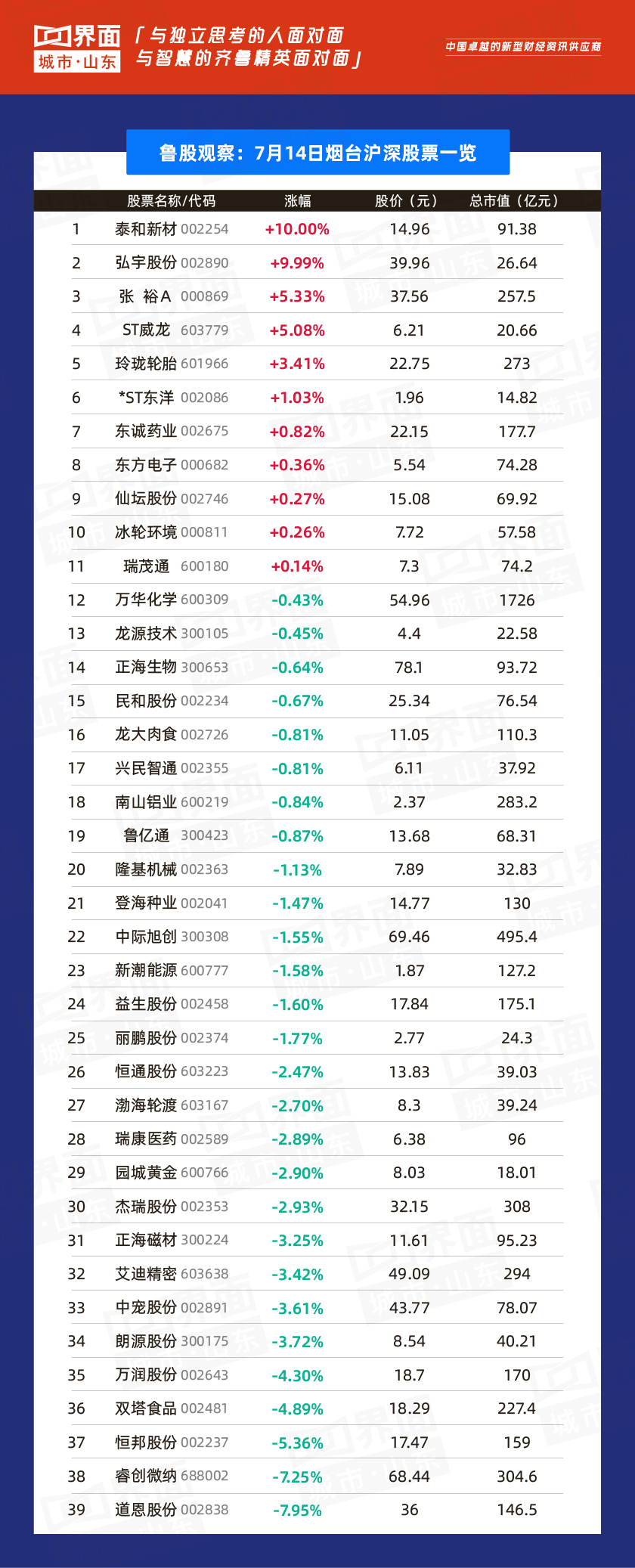 受大盘影响,7月14日,山东省内沪深股票有73只个股上涨,135只下跌,13只与上一个交易日收盘价持平。