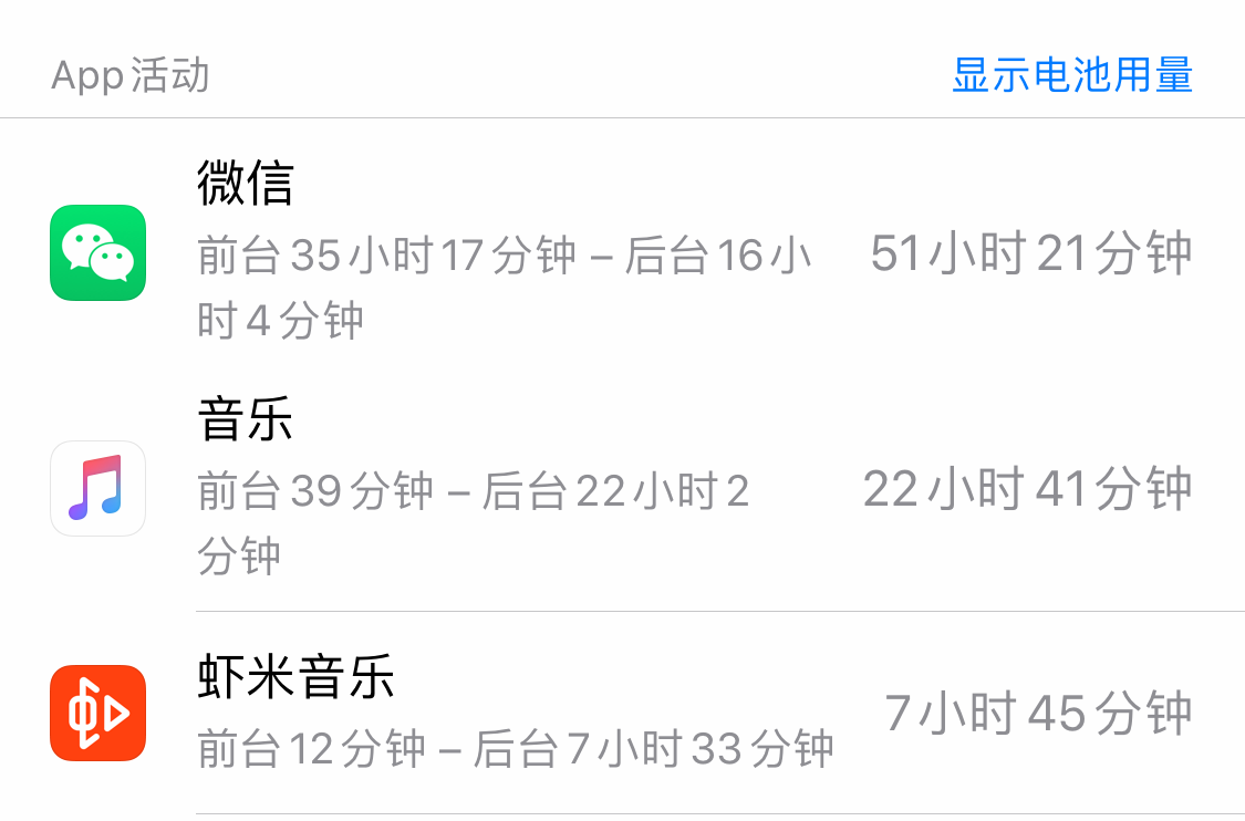 或许因为Apple Music用户并不多,并没有国内用户反映该问题。不过界面新闻记者经体验发现,国内Apple Music似乎也同样有后台频繁活跃的问题。在10天内,虾米音乐和Apple Music使用频率和时长相差无几的情况下,Apple Music的后台运行时长更长,达到22小时,虾米音乐则只有7.5小时。相比之下,最常用的微信后台运行时长为16小时。