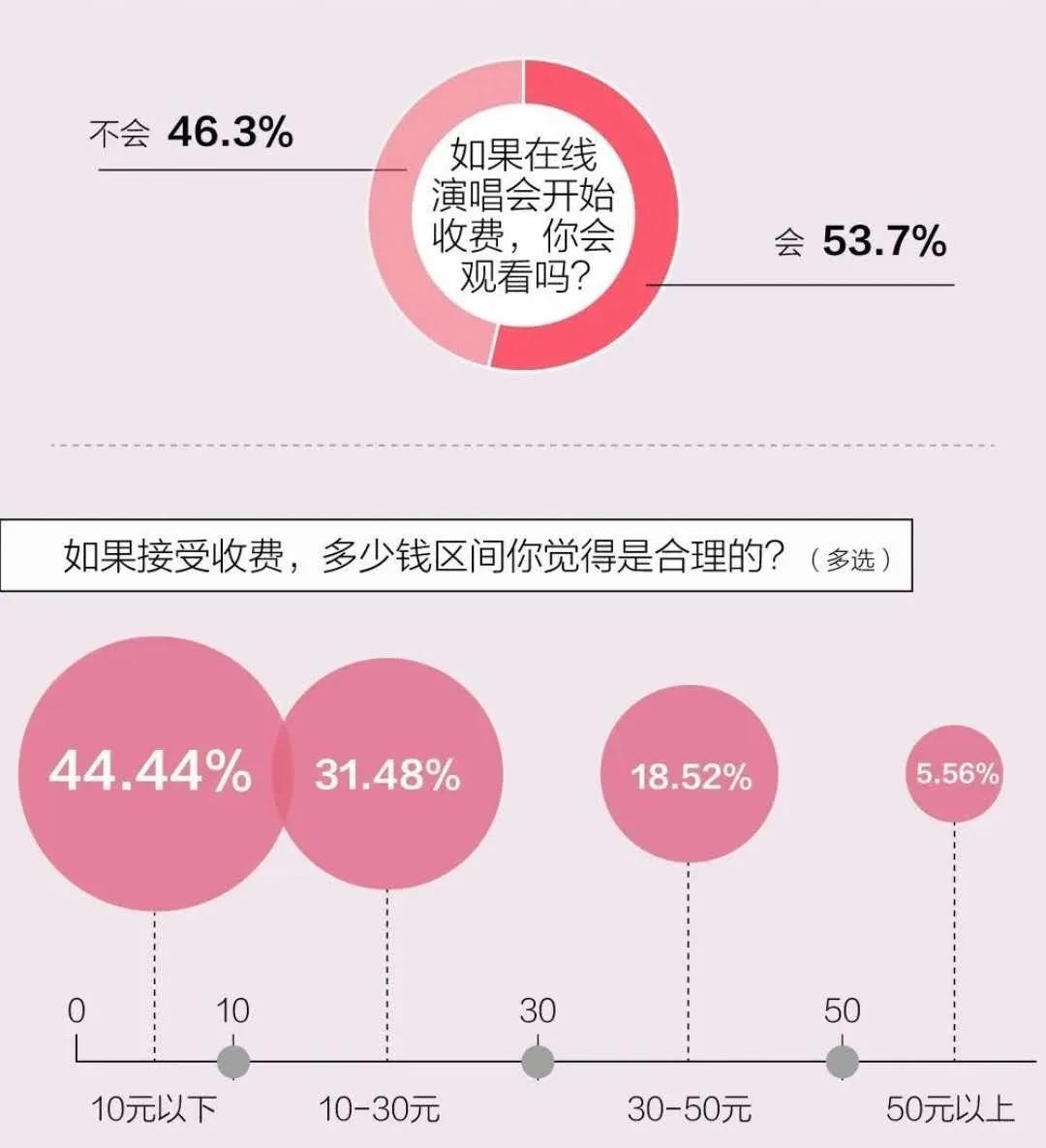今年6月,《新京报》做了一个关于“线上演唱会观众买账吗?”的调查,108个样本中,表示会看线上演唱会的占比为53.7%,不会看的占比为46.3%,且有44.44%的人觉得10元以下为可接受的合理收费,可见我国线上演唱会付费市场的低迷。
