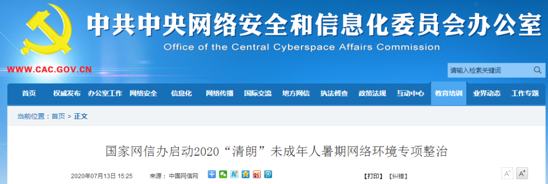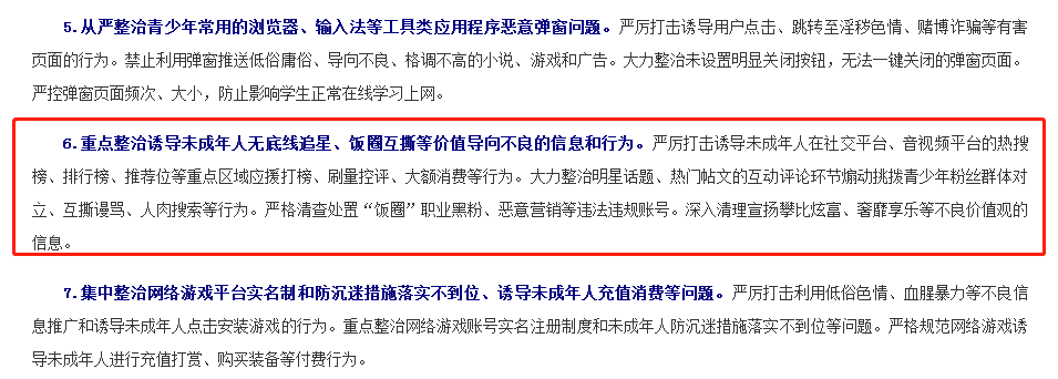 正巧,昨日国家网信办发布了关于开展2020“清朗”未成年人暑期网络环境专项整治的通知,其中一个方面是重点整治诱导未成年人无底线追星、饭圈互撕等价值导向不良的信息和行为。严厉打击诱导未成年人在社交平台、音视频平台的热搜榜、排行榜、推荐位等重点区域应援打榜、刷量控评、大额消费等行为。