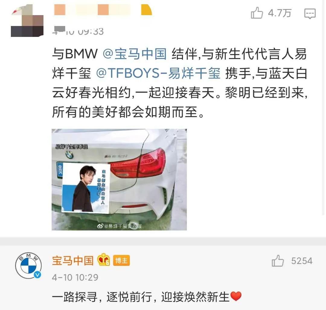 总的来说,拥有至少20%死忠粉的流量明星不论是代言还是直播带货,都是不愁带不动、卖不出货的,今年4月,易烊千玺成为宝马最新代言人,@宝马中国的官宣微博的评论区,粉丝争相晒单,直接变成了车展。