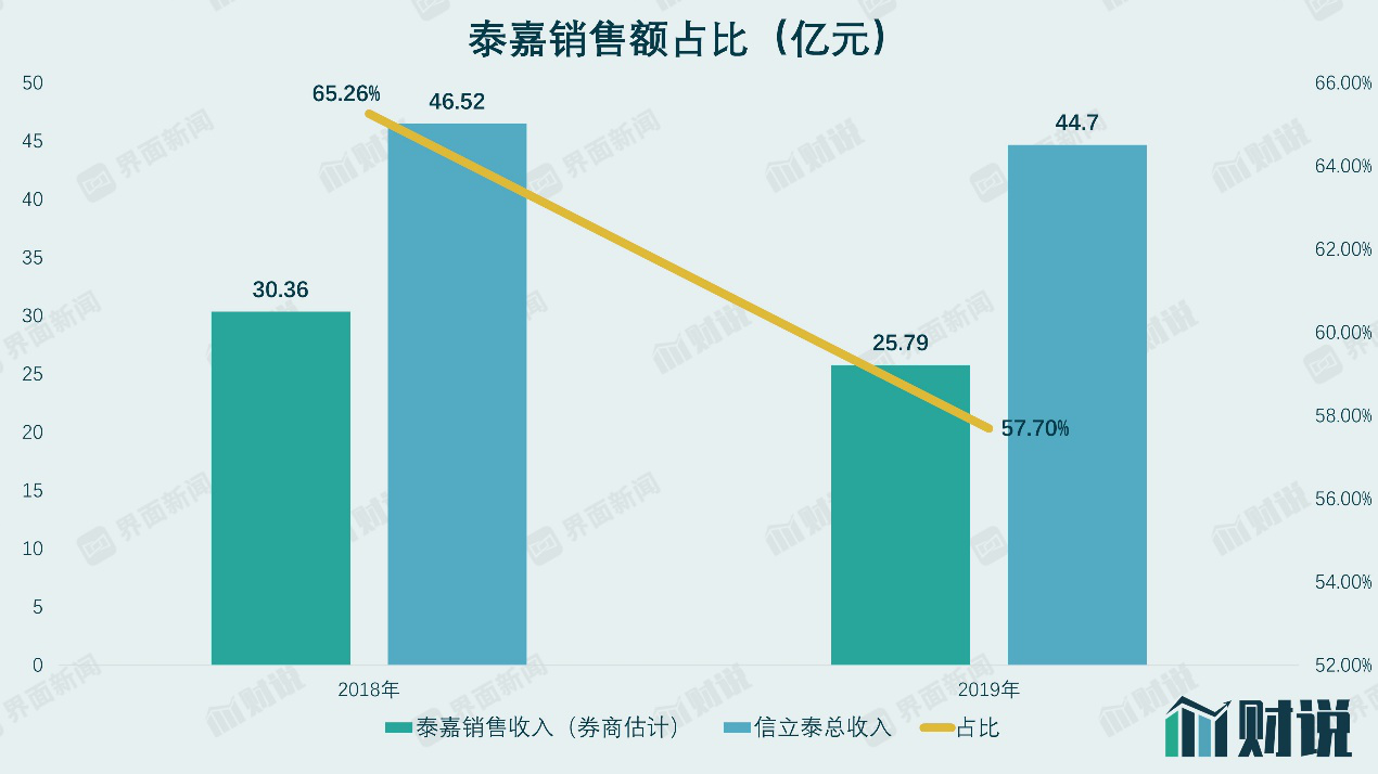 信立泰并没有在年报中公布泰嘉的详细销售数据。根据券商研报的估计,泰嘉在2018年与2019年的销售收入分别为30.36亿元与25.79亿元,占总收入比重分别为65.26%和57.70%。