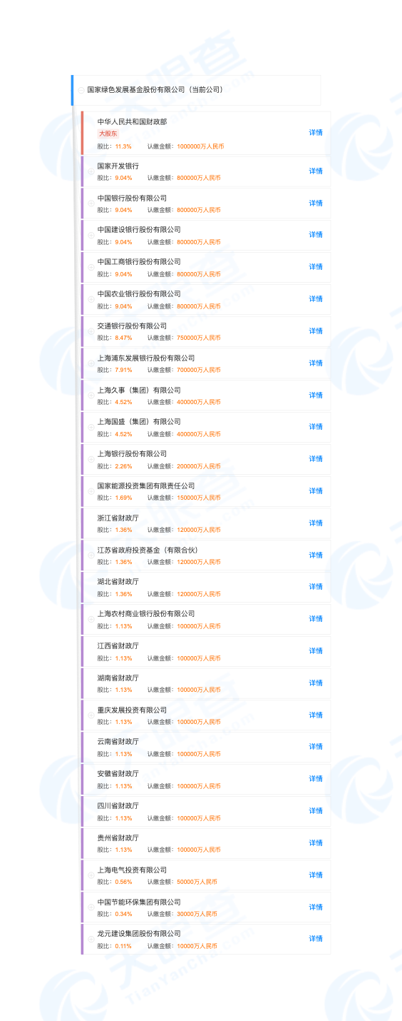 天眼查数据显示,7月14日,国家绿色发展基金股份有限公司成立,法定代表人为过剑飞,注册资本885亿元,公司经营范围包括股权投资、项目投资、投资管理、投资咨询。财政部为该公司第一大股东,持股比例为11.30%;第二大股东分别为国家开发银行、中国银行、建设银行、工商银行、农业银行,各持股9.04%。