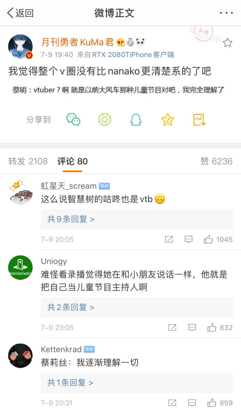 凭借“中之人”与二次元小萝莉形象的巨大反差,这场直播成为了虚拟主播界有史以来“次元壁炸裂”程度最高的线上活动之一。而“菜菜子Nanako”这位刚出道的虚拟主播,也因为超强的话题性,在首次直播活动中就达成了“百舰”成就,甚至在下播后直播间人气还一度达到了660万,直播录屏片段在微博上也同样引起了大量二次元爱好者的转发和关注。