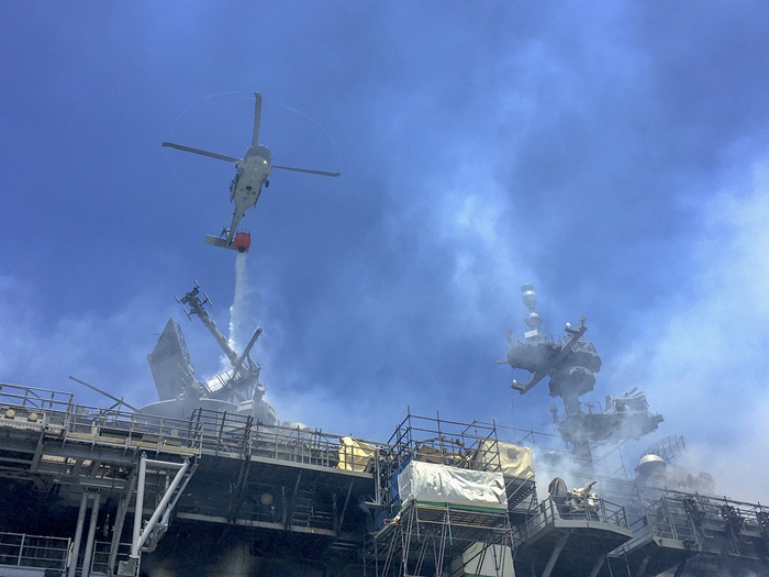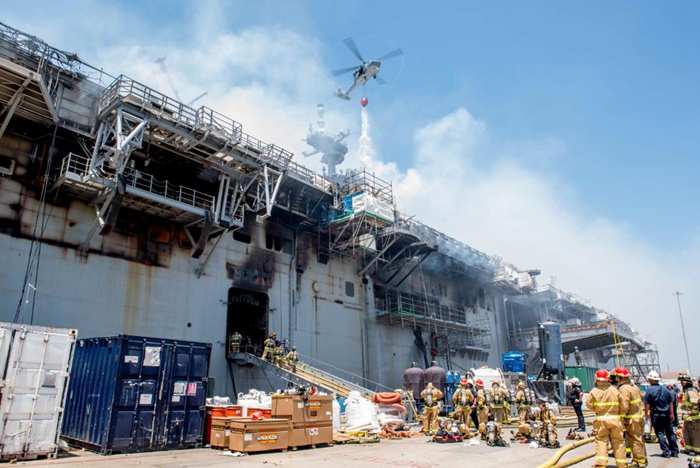 截至周二,救援直升机已经向“好人理查德”号投下1200桶水,以便消防员进入攻击舰内部灭火。但大火依然持续,攻击舰的首尾两端均在燃烧。