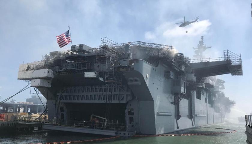 自从7月12日起火后,停泊在美国加利福尼亚州圣迭戈海军基地的两栖攻击舰“好人理查德”号依然在燃烧。
