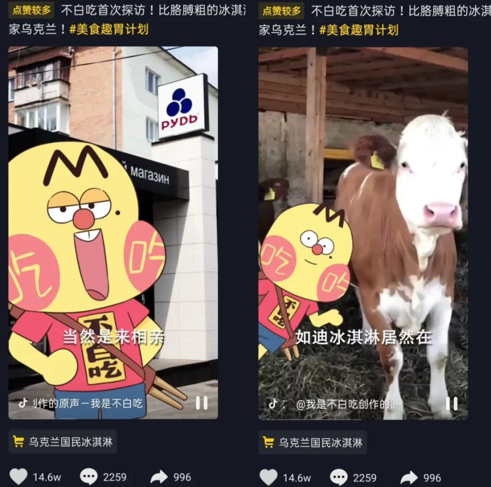 “‘我是不白吃’在有了带货人设和目标之后,每一条短视频都植入了商品的亮点,比如说如迪冰淇淋,内容团队用段子挖掘乌克兰人怎么理解冰激凌,用动漫短视频呈现卖点,这款商品也很快就上了抖音24小时好物榜首。”朱宇辰介绍。