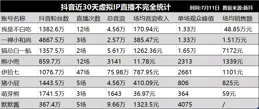 进入6月后,“我是不白吃”的带货金额虽然会有所波动,但在众虚拟主播中仍属于表现最突出的。7月11日的新抖数据显示,近一个月里,“我是不白吃”场均销售额为48.85万元,“猫总骆一航”平均销售额为7172元,“伊拾七”平均销售额为1101元。