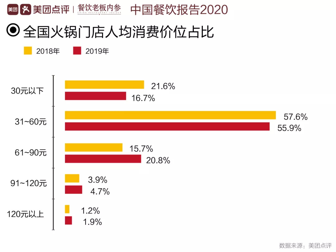 把时间线拉长,就可以看到,平价火锅一直是行业主流。人均消费31-60元的火锅是大众主流。在2019年,31-60元价位的火锅占比下滑1.7%,不过仍然占领了55.9%的市场份额。