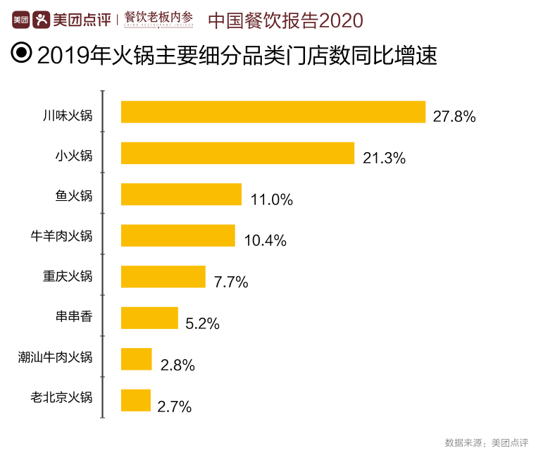 另一个潜力股细分品类则是小火锅。去年小火锅增速达到21.3%,证明“一人食”火锅的需求仍然存在。在疫情影响下,小火锅又或可能成为今年增长潜力更强的细分品类。