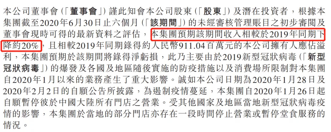 7月6日,海底捞发布亏损预警:预期上半年收入相较于2019年同期下降约20%,且相较2019年同期录得约人民币911.04百万元的本公司拥有人应占溢利,预期该期间将录得净亏损。