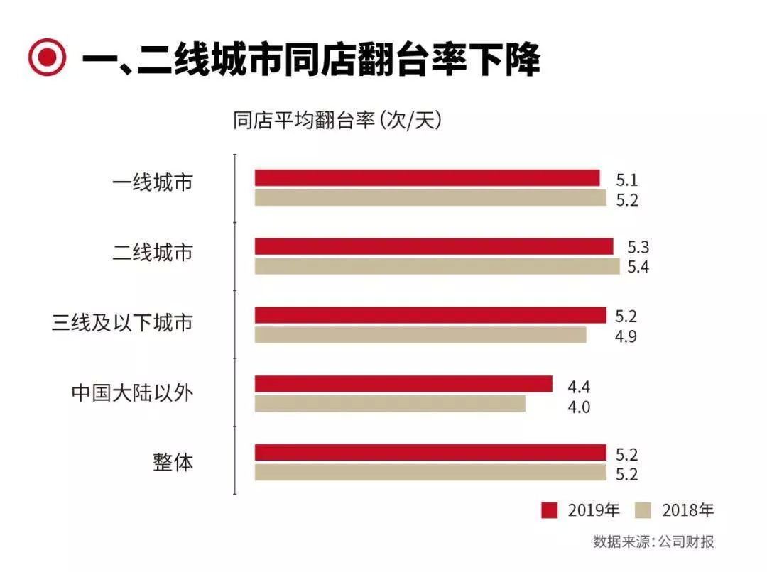 海底捞的年报数据也佐证了下沉市场的机会。根据海底捞2019年财报,其在一、二线城市的翻台率都下降了0.1,而三线及以下城市的翻台率提升了0.3。可见,下沉市场还有不小的成长空间。