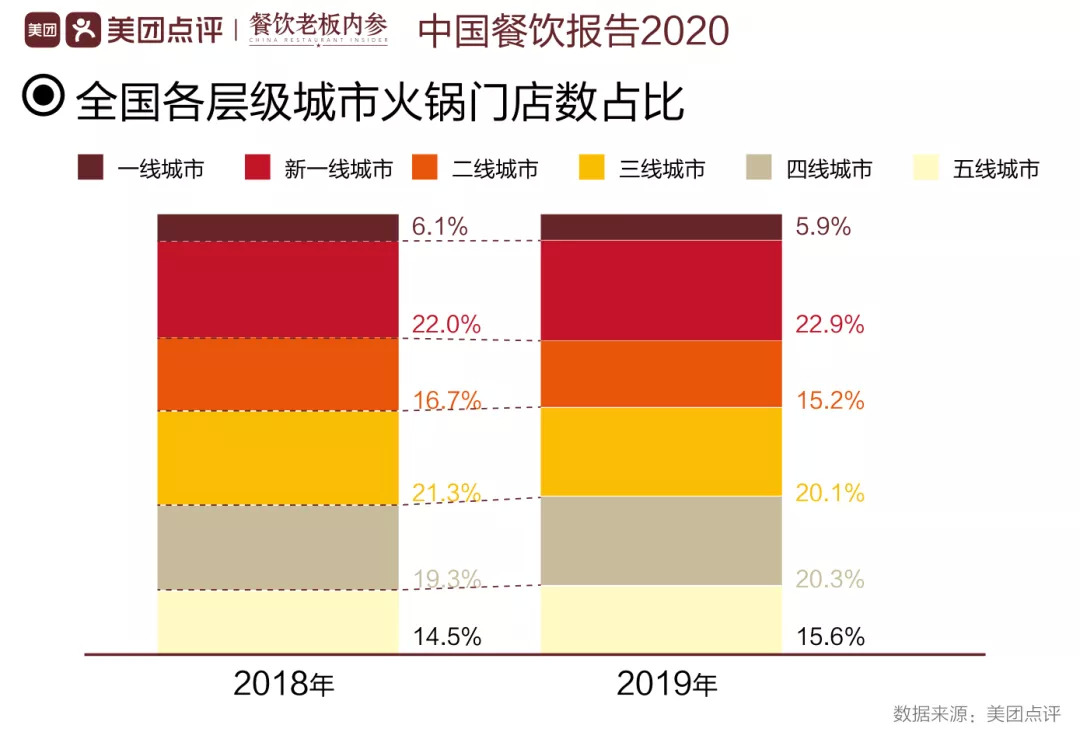 新一线与四五线城市则呈现上涨趋势。新一线城市的火锅门店数占比上涨0.9%,四、五线城市数据上涨更加明显,分别上涨1%和1.1%。