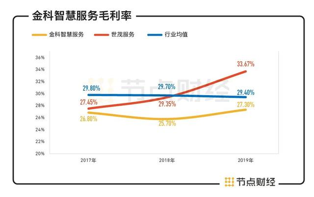 招股书显示,2017-2019年,金科智慧服务的整体毛利率分别为26.8%、25.7%、27.3%,有微小波动,不过这一毛利率低于行业均值。