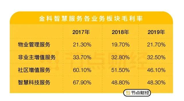 按业务构成区分,金科智慧服务四大业务板块物业管理服务、非业主增值服务、社区增值服务和智慧科技服务中,除了物业管理服务毛利率在2019年有小幅提升外,其他均出现不同程度的下滑。