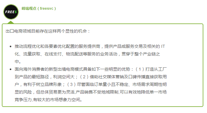 峰瑞资本(FREES FUND)长期关注跨境电商,更于近日投资了瞄准美国市场的母婴用品移动电商 Pat Pat。在我们看来,中国企业有天然的成本优势,但容易受制于物流、支付、平台选择的问题。绝大多数的企业都停滞于扩大 SKU,很难进一步实现精细化运营、建立自有渠道和品牌。而该行业的显著机会包括了面向电商平台的服务提供商,以及直接对接海外消费者的出口企业。