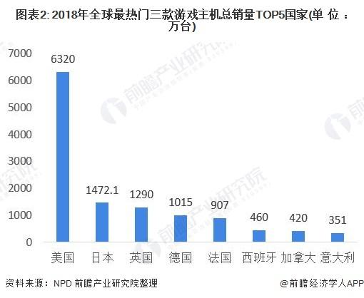 根据Newzoo数据显示,2019年全球主机游戏市场份额为32%,移动游戏和PC游戏分别占到45%和23%,其中北美地区是主机游戏最大的消费市场。据NPD相关数据显示,2018年全球最热门的三款游戏主机总销量地区,排名第一的是美国,达到6320万台,是排名第二日本的4倍左右。