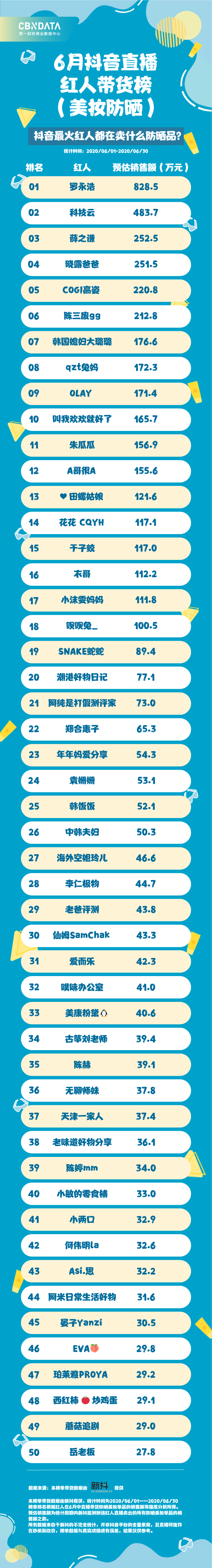 追踪6月抖音直播间数据,CBNData与新抖携手推出这张防晒榜单,一起来看看抖音上“猪猪女孩、男孩”们的防晒pick吧。