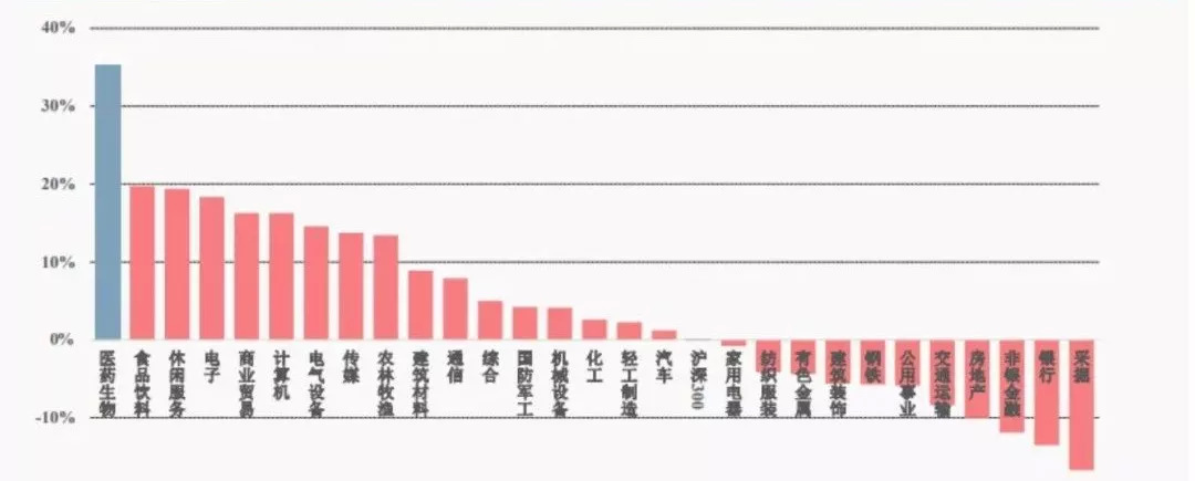 即便是在放水时代,其他行业也大多经历了冲高回落,坐过山车,而只有医疗健康板块从头涨到尾,跑赢各路指数。