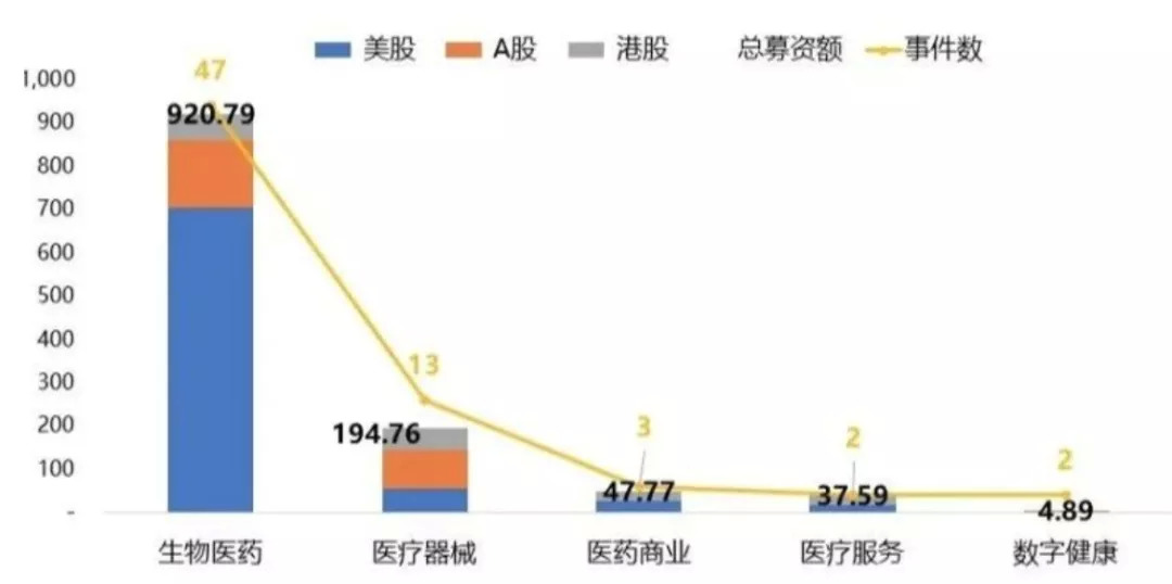 生物医药募资居首,达到920.79亿元,IPO项目47个;