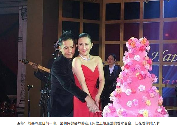 嘉玲去年的生日被刷爆朋友圈,因为简直堪比金马奖颁奖典礼,在君悦酒店斥资几百万邀请各路名流和明星好友,真正是众星捧月,好闺蜜从王菲、钟楚红、到杨千嬅、邱淑贞,好兄弟钟镇涛、曾志伟到杜德伟,嘉玲姐在娱乐圈真是出名的好人缘,最劲爆的是她居然穿着95年出席金马奖时的裙子挽着老公梁朝伟优雅走来,要知道经过了19年还可以穿进同一条裙子,挽着同一位长情陪伴的男人是多么不容易的事情!刘嘉玲做到了!当然现场也是隆重!华丽!华丽丽!