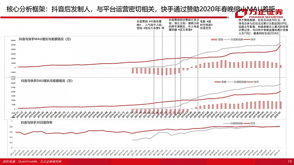 快手当然不甘心。2020年初,快手独家赞助春晚。据方正证券提供的数据图来看,截止到2020年1月,抖音和快手的DAU和MAU都有逐渐缩小的趋势。