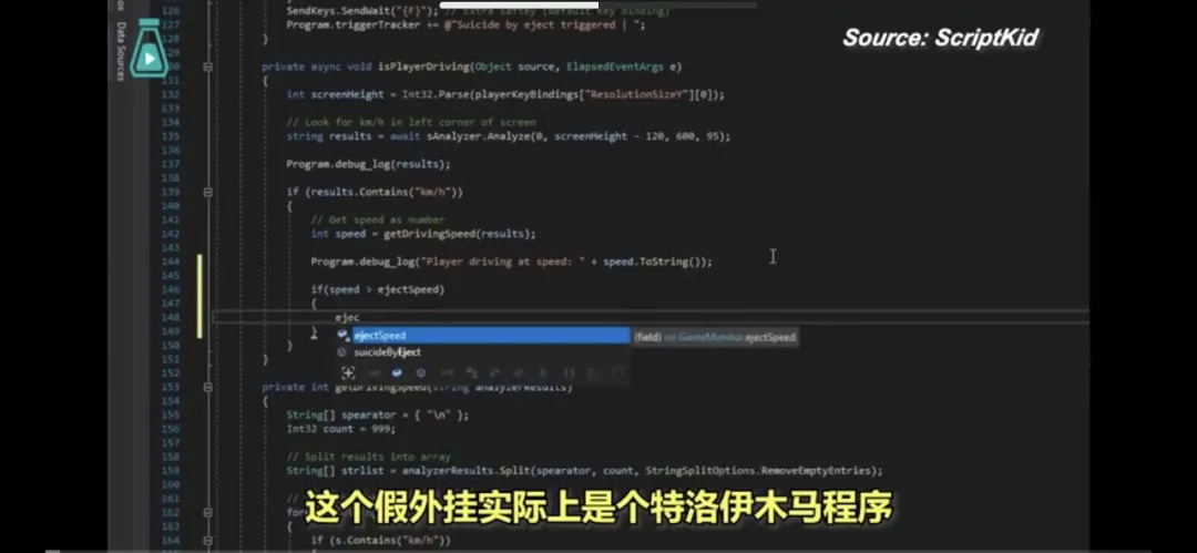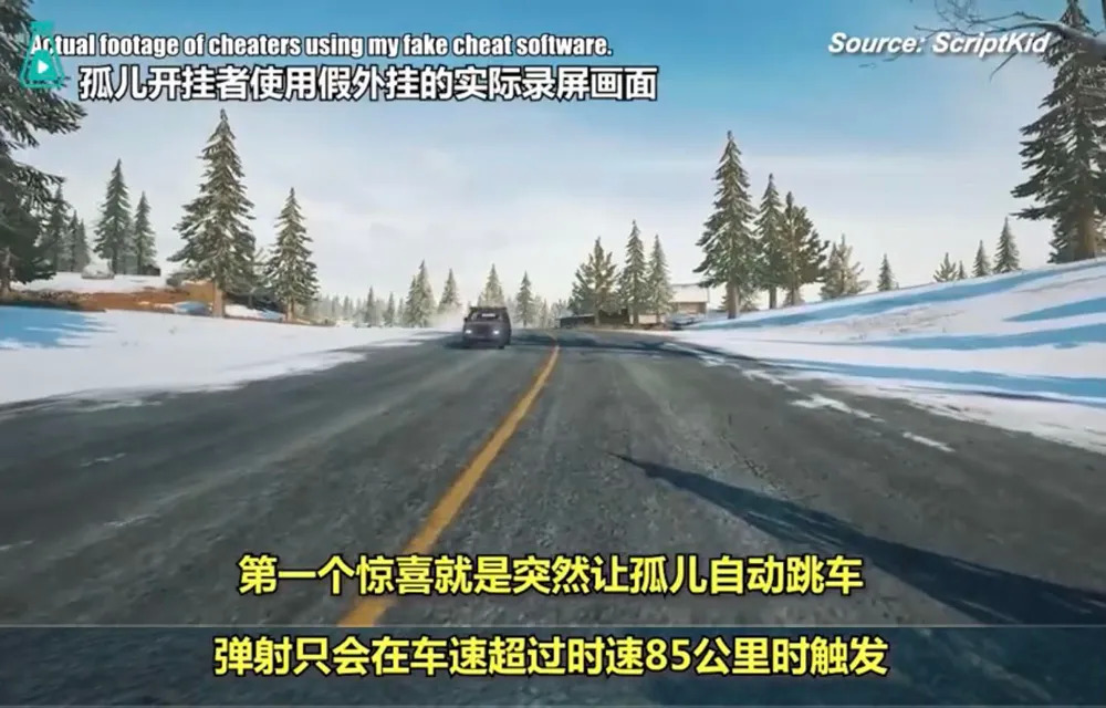 比如在PUBG的外挂里面,这位开发者就准备了三个“惊喜”送给外挂玩家。第一个是自动跳车,当外挂玩家的车速达到85KM的时候,外挂玩家会自动跳出车外。
