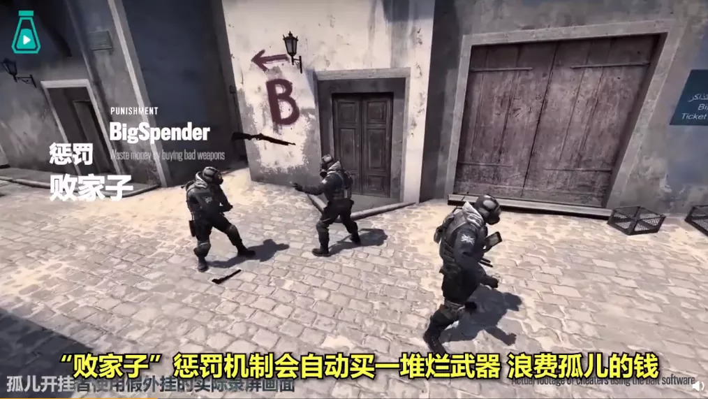 第三个“惊喜”是开启败家子模式,当游戏开局后,外挂玩家会自动购买一系列垃圾武装备,然后浪费掉外挂玩家的钱。