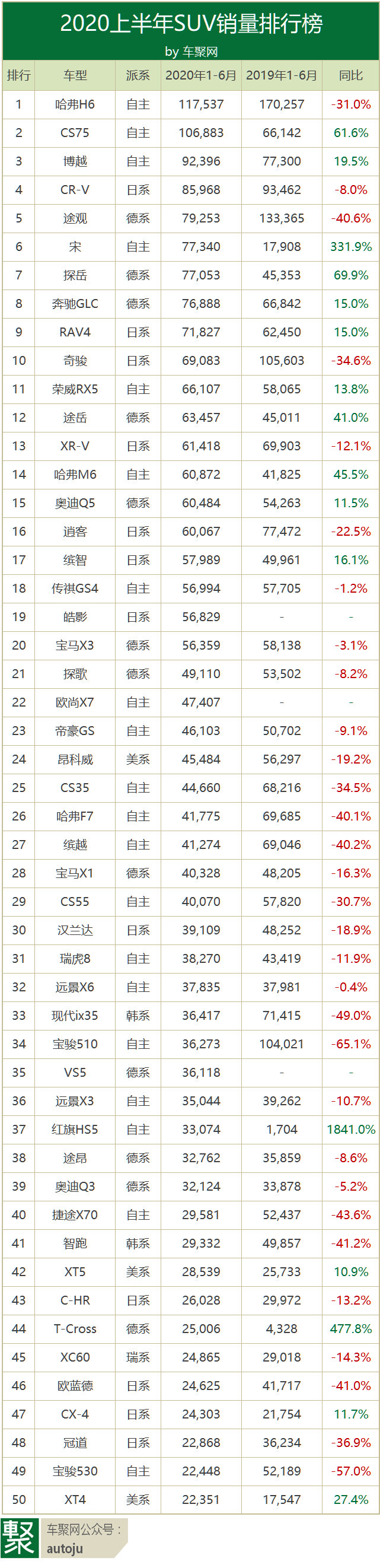 其他入围前十的SUV中,日系和德系分别瓜分了3款。日系有CR-V(第4位,8.60万辆)、RAV4(第9位,7.18万辆)和奇骏(第10位,6.91万辆);德系有途观(第5位,7.93万辆)、探岳(第7位,7.71万辆)和奔驰GLC(第8位,7.69万辆)。