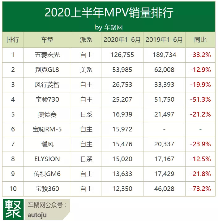 近些年MPV市场份额持续萎缩,今年上半年更是如此。1-6月,MPV累计销量为43.3万辆,同比下滑38.5%,跌幅远高于乘用车整体(-22.5%),市占率降至5.6%。