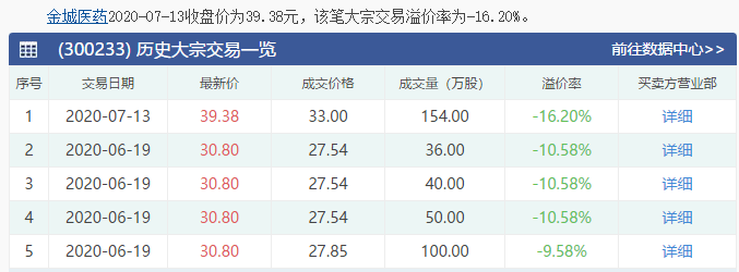 先是公司实际控制人赵鸿富减持513万股,占总股本1.3%,此后金城医药董事、董秘、总经理、副总经理、财务总监等多位高管联合在大宗交易抛售股份,累计减持近1500万股,