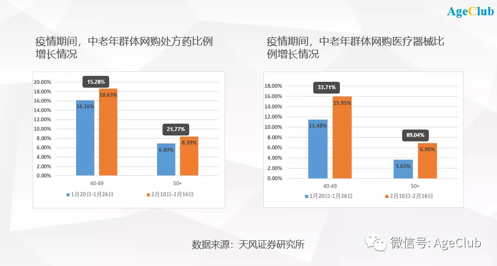 拿药品和医疗器械举例,中老年通过网络购买药品/医疗器械/保健品的比例提升明显。在疫情期间,50+中老年群体网购医疗健康器械比例增长最为显著,超过89%。