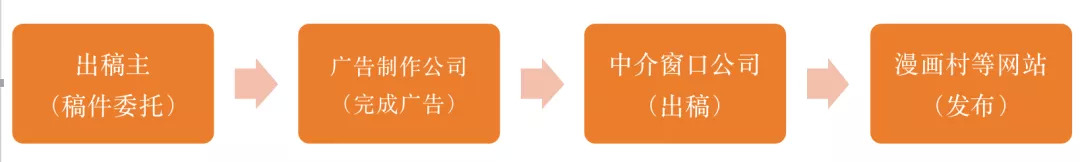 在这一过程中,出稿主将自己的商品广告委托和广告费发送给广告制作公司,广告制作商根据委托和广告费制作相关广告,并发送给中介商。中介商通常同时负责多个广告公司与多个网站的联系。中介将成品广告发送给“漫画村”,而“漫画村”将广告登载在网站上开始计费。