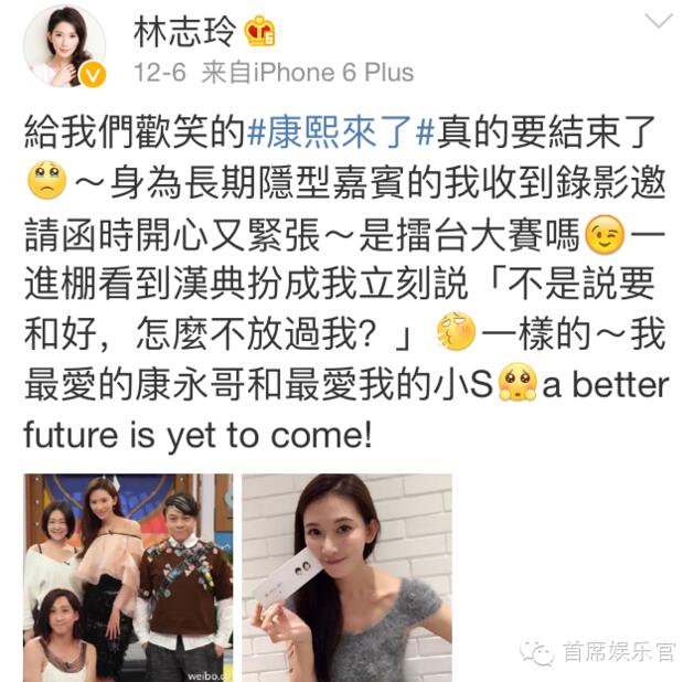 先来说下最近的事儿,《康熙来了》已经进入倒数阶段,最后几期的节目嘉宾也是备受关注。已经录过7次《康熙》的林志玲在微博上爆照,称自己参与了最新一期的拍摄。