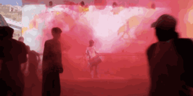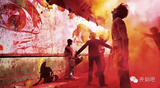 满大街的少年向墙壁泼洒着五彩的颜料,