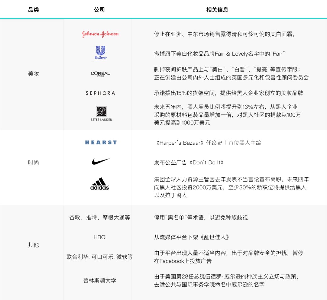 由黑人男子弗洛伊德之死点燃的全美多地抗议活动仍在继续。面对沸腾的民意,包括Nike、adidas、开云集团、欧莱雅集团、联合利华集团、强生公司在内的多家公司均公开表示反对种族歧视,并在组织架构、有色人种员工比例、产品以及品牌宣传等多个层面推出相应措施以提升企业的多元性。