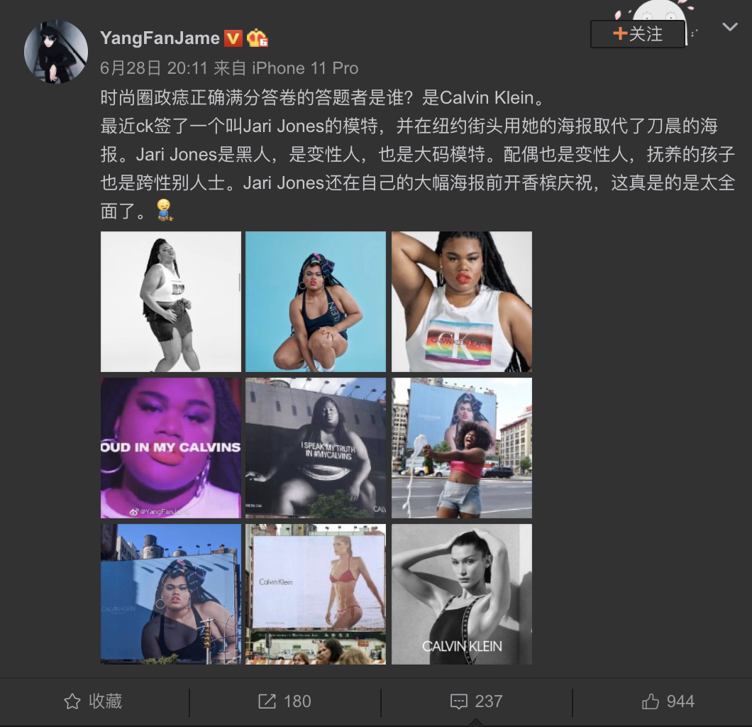Calvin Klein的骄傲月战役将讨论热度推上顶点。由于同时具备大码+黑人+跨性别标签,登上CK广告的Jari Jones被称为“美国历史上政治最正确的模特”。一部分人认为应该鼓励宣传多元化审美的品牌,但也有声音指出保持政治正确只是品牌的财富密码,并且已经走向极端。
