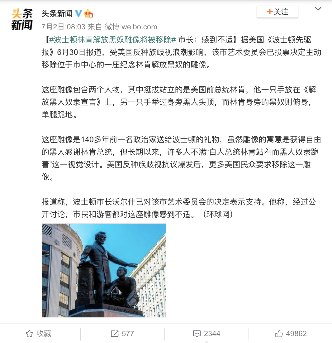 对于黑人来说,独立战争是一场不充分、不彻底的革命。革命的胜利果实被窃取,奴隶主被当作英雄。这也是为什么抗议者会走上街头拆除雕像、批评美化奴隶制的《乱世佳人》、要求耶鲁大学改名(耶鲁是以奴隶主伊利胡·耶鲁命名的)。