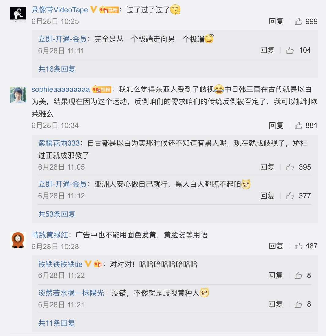 在各大美妆集团下架美白产品的新闻下,可以看到中国网民对“政治正确”的不理解甚至是反感情绪——他们认为这种做法是从一个极端走向另一个极端、感觉东亚人也受到了歧视、建议在广告中去掉面色发黄等与“黄”有关的用词。