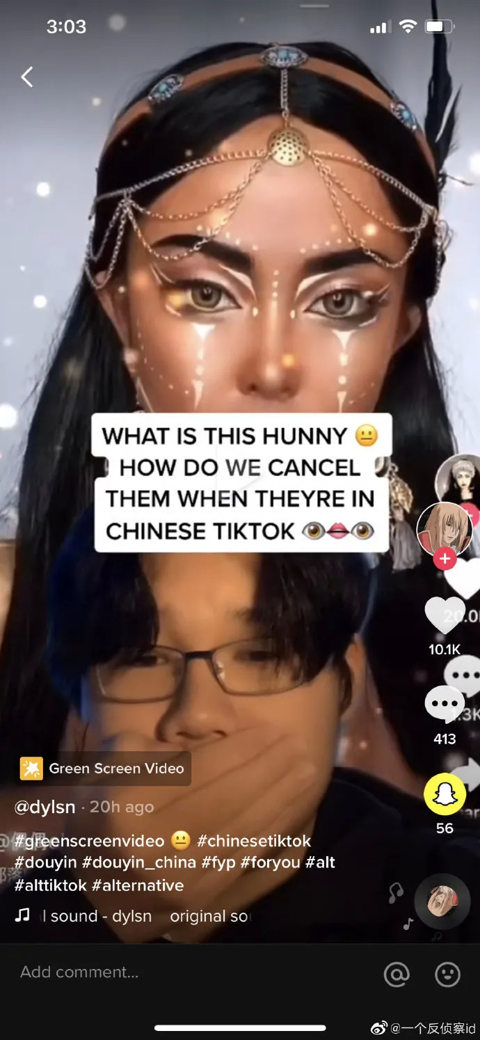 值得注意的是,这种情绪正在蔓延,并伴随着亚裔同样也是种族歧视受害者的意识觉醒。Tiktok用户来到抖音,指责抖音用户上传的欧美仿妆视频是在“扮黑脸”,有歧视黑人的嫌疑,而埃及艳后之类的滤镜则是一种“文化挪用”,并且试图将Cancel Culture带到抖音。