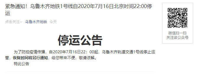 乌鲁木齐地铁官方微信号7月16日发布停运公告:乌鲁木齐地铁为了防控疫情传播,自2020年7月16日22:00起,乌鲁木齐轨道交通1号线停止运营,恢复时间将另行通知,给您带来不便,敬请谅解。