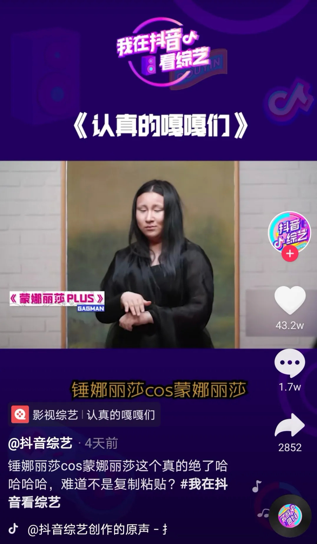 尤其是《认真的嘎嘎们》节目中“一发技”的设定,其实更像是现场互动版的短视频拍摄。节目中的部分片段,在短视频平台更容易出圈,像是锤娜丽莎cos蒙娜丽莎的段落,在抖音短视频收获了超过43万的点赞量。